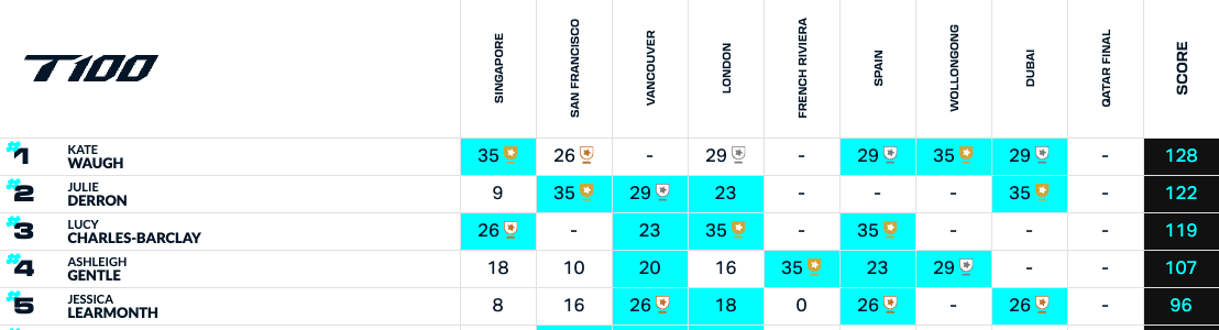 Kate Waugh, Julie Derron e Lucy Charles-Barclay tem 2 vitórias cada. Quem vencer entre elas vence o título. Ash Gentle, que já foi conhecida com a rainha da distância de 100km, corre (literalmente) por fora nesta disputa mas parece ter encaixado melhores resultados no segundo semestre. Precisa vencer e torcer para que as atletas da frente do ranking fiquem fora do pódio. Jessica Learmonth ainda tem chances matemáticas mas o cenário é bem mais duro: tem que vencer e torcer por tropeço grande das 4 primeiras.