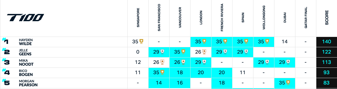 Ele só teve um resultado diferente de derrota no T100, que foi em Dubai na etapa passada onde deu uma volta a mais no ciclismo (lembram daquele caos na prova né?). Ele vem pra vencer a abrir ainda mais do segundo colocado, ninguém mais ninguém menos que Jelle Geens. O belga, bicampeão de 70.3, venceu Wilde ano passado na Nova Zelândia e quer tentar confirmar seu bom momento e pelo menos bagunçar um pouco essa disputa. Mika Noodt vem de um ano extremamente consistente mas para vencer, depende de tropeço dos dois atletas na sua frente, que precisam ficar fora do pódio. Rico Bogen ainda tem chances remotas mas também precisa de um cenário "milagroso". Morgan Pearson venceu a confusa etapa de Dubai mas não tem chances de títulos.